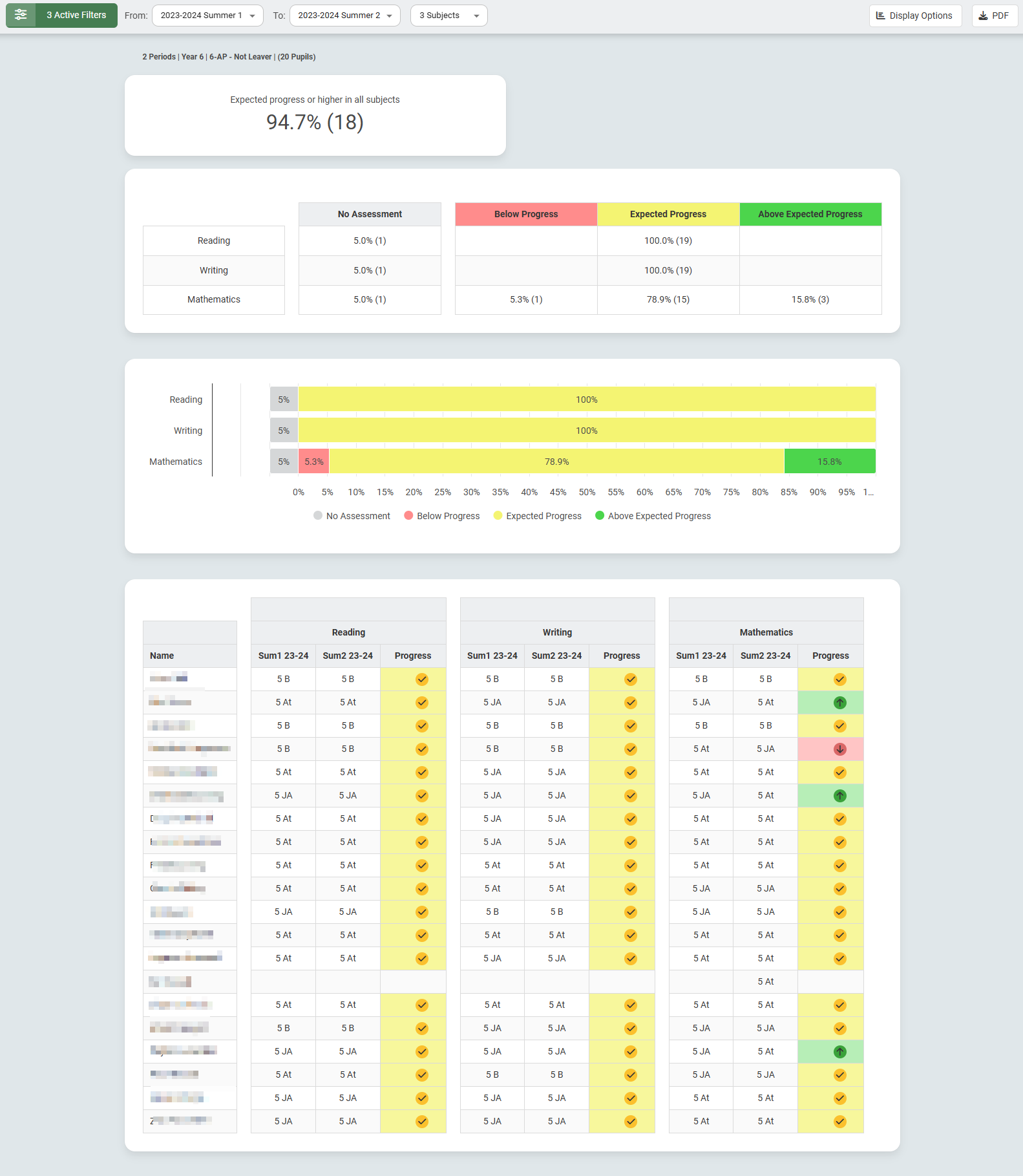 The Summative Progress Analysis reports (Sonar Tracker: EYFS (2020) Summative Progress Analysis Report and Sonar Tracker: Primary Summative Progress Analysis Report) let you view your pupil assessments and progress in a tabular format between two points in time by subject. The example below is taken from a Primary Summative Progress Analysis report: