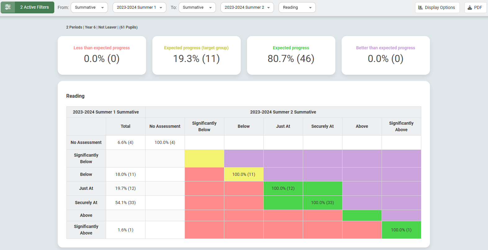 With a PITA model, a pupil has made progress if they have been assessed at the same judgement in two assessment points; Just At to Just At, Securely At to Securely At etc. A pupil who was assessed as Just At and then Securely At will show as having made more than expected progress.