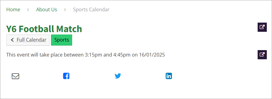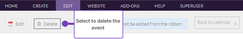 The Calendar event page opens: - Select Delete from the Edit tab:
