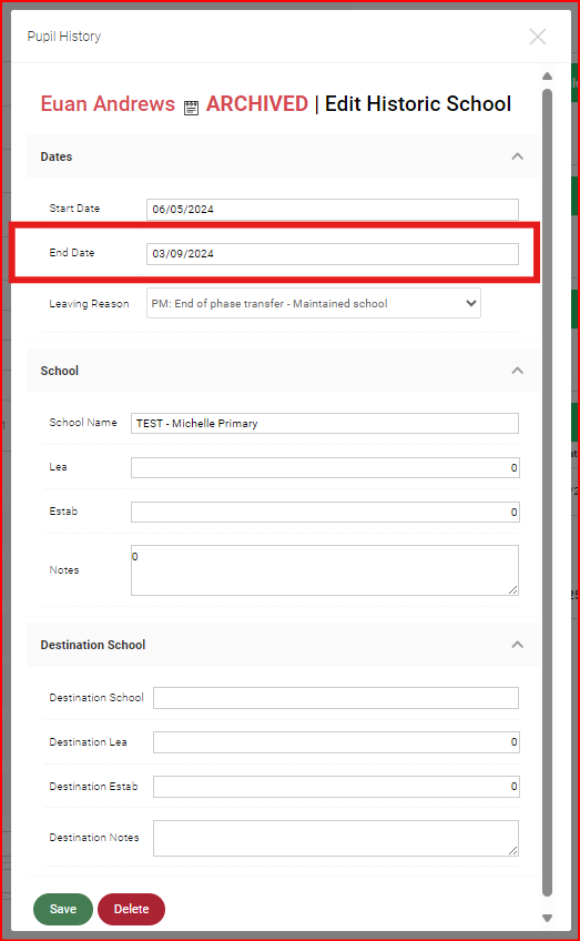 6. In the pop up window that appears (see example below) amend the end date field so that it correctly reflects the actual last day that the pupil was on roll at your school.