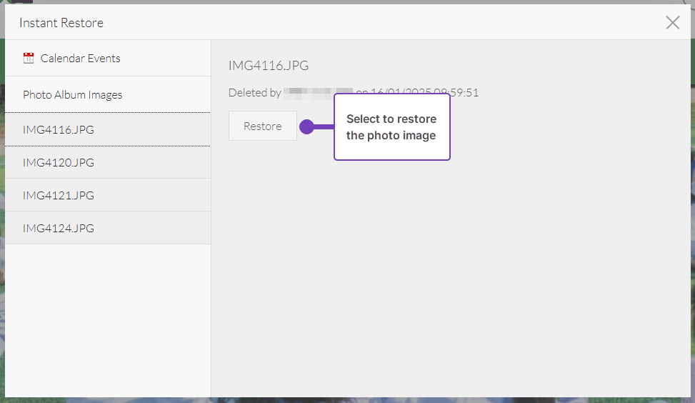 - From the list of available photo album images that have been deleted, select the title of the image you want to restore: