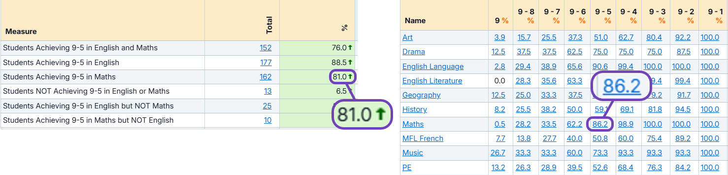 The example reports below show 81.0% of Students Achieving 9-5 in Maths on the left report, and 86.2% on the right, despite both having a grade count showing 162:
