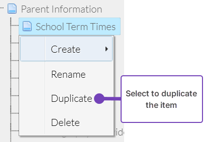 - Right-click on the page or form you want to duplicate and select Duplicate: