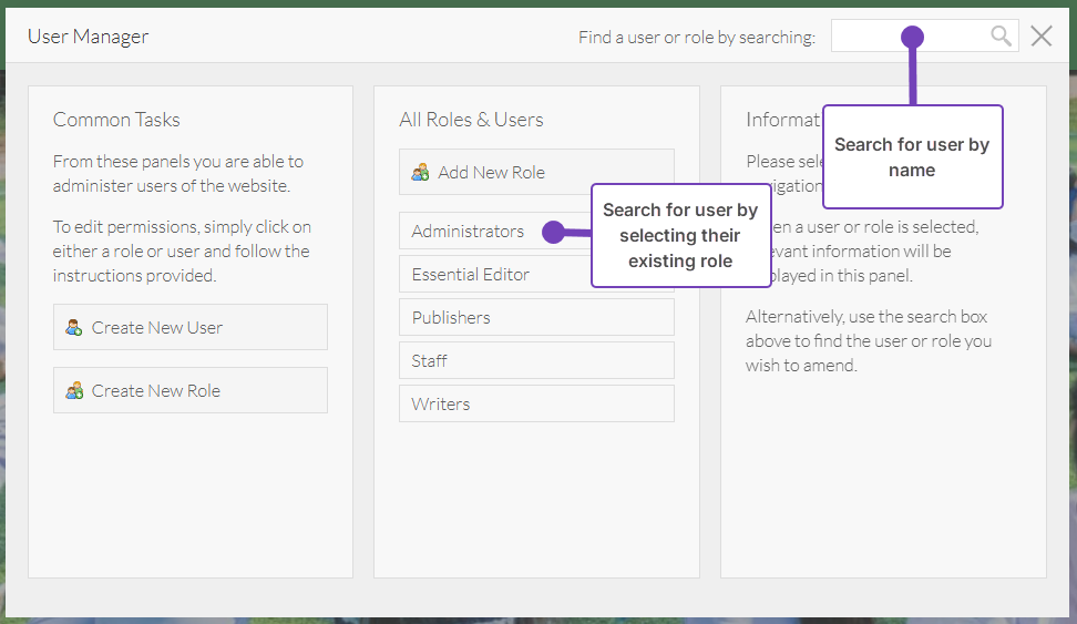 As you add more users and roles, use the search bar at the top of the page to speed up your search, rather than browsing through the individual names within a specific role. Type the user's name into the search bar and select the magnifying glass to complete the search.