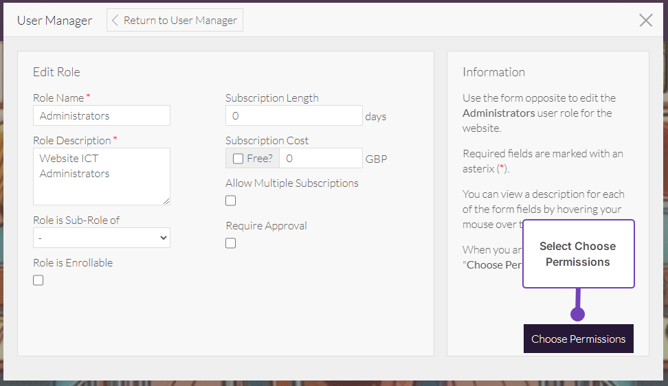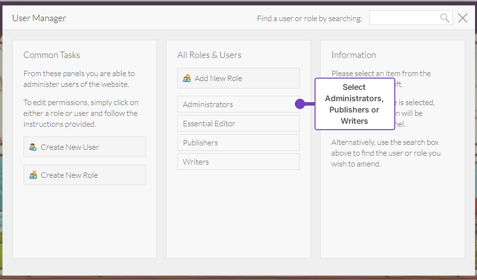 - Select either the Administrators, Publishers or Writers role to assign the permission to: