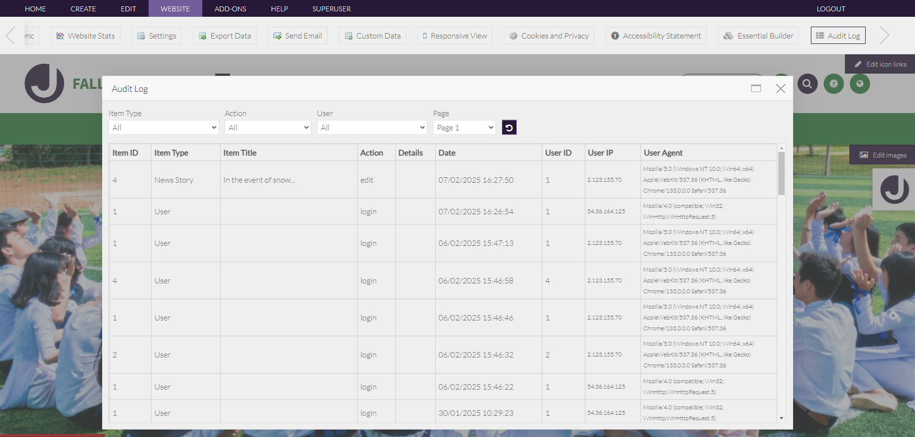 The following article explains how you can access the Audit Log to view and interrogate the various transactions that have taken place on the website. You can check who created, edited and deleted content on your site, who moved and renamed items and see who logged in along with details of any failed logins.