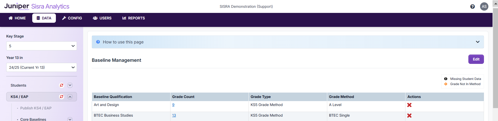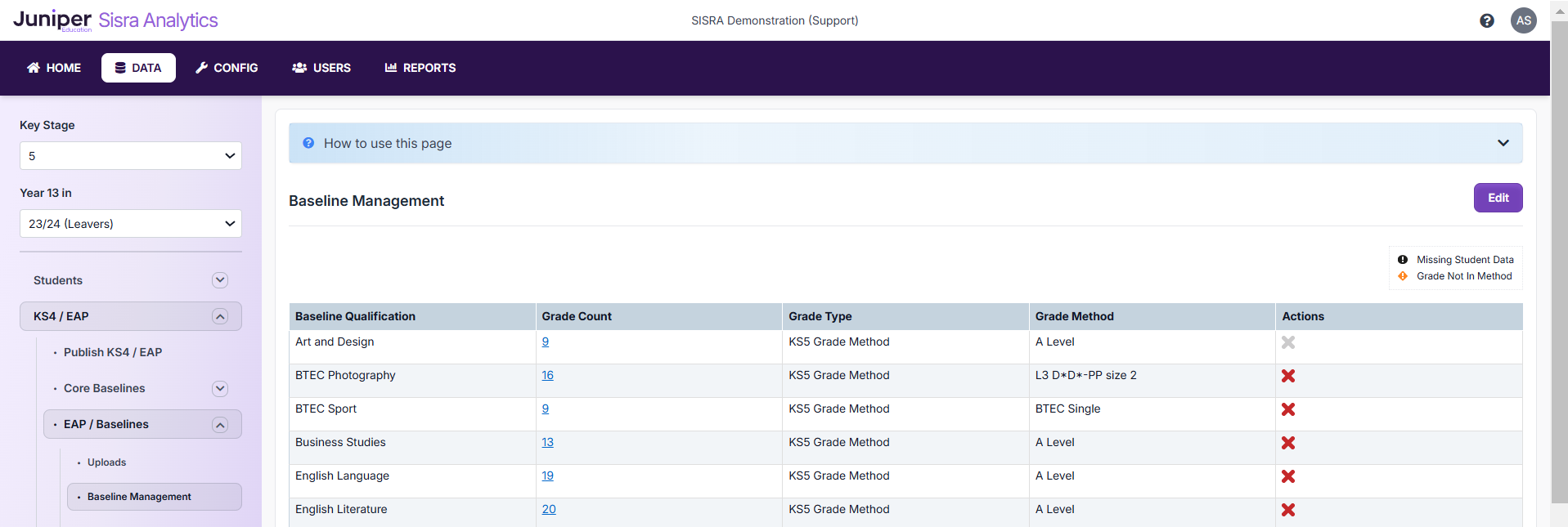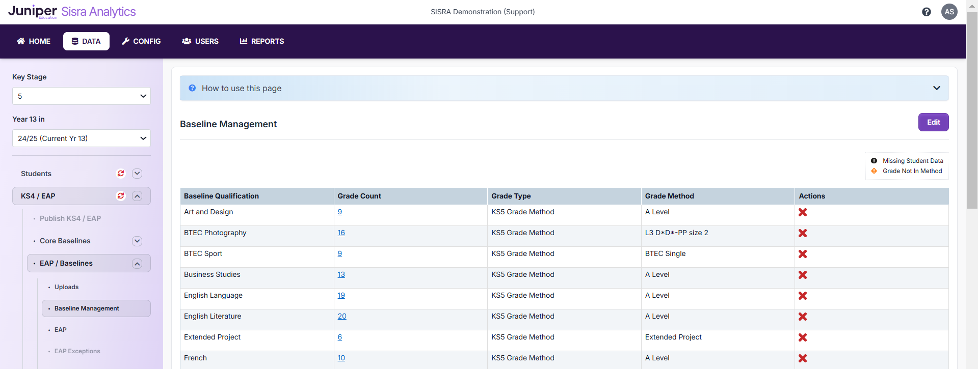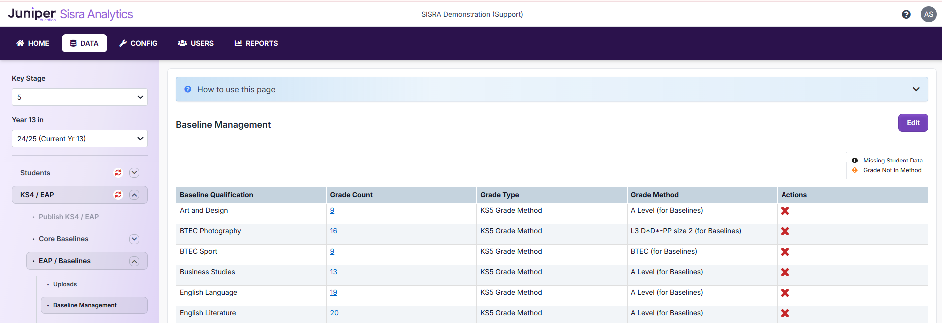 However, if you navigate back to your Current Cohort's KS4 / EAP > EAP / Baselines > Baseline Management page - in my example, DATA > KS5 > 24/25 (Current Yr 13) > KS4 / EAP > EAP / Baselines > Baseline Management, you should see these baselines have been set up using the 'A Level (for Baselines)' grade method.