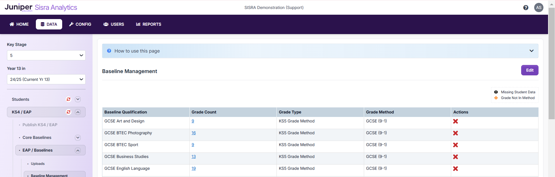 Then you can navigate to KS4 / EAP > EAP / Baselines > Baseline Management, click 'Edit' and set these new baselines up to match the grade methods in your Copying Cohort.