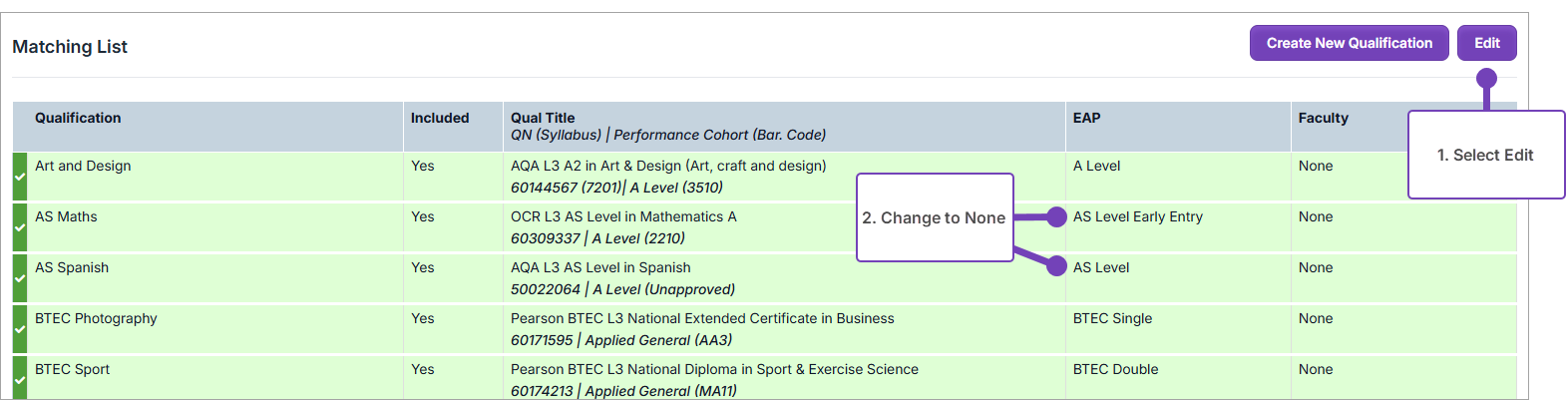 - For each Qualification using the EAPs, select the existing EAP, and change it to None. The Subject(s) will turn grey. In this example, two subjects AS Maths, and AS Spanish are changed to None.