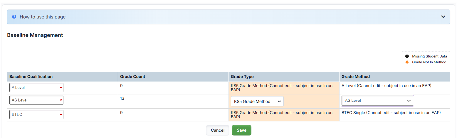 Follow the steps below to change the Grade Method of an in-use EAP Baseline, for example, editing the Grade Method for an AS Level Baseline, to the AS Level Grade Method: