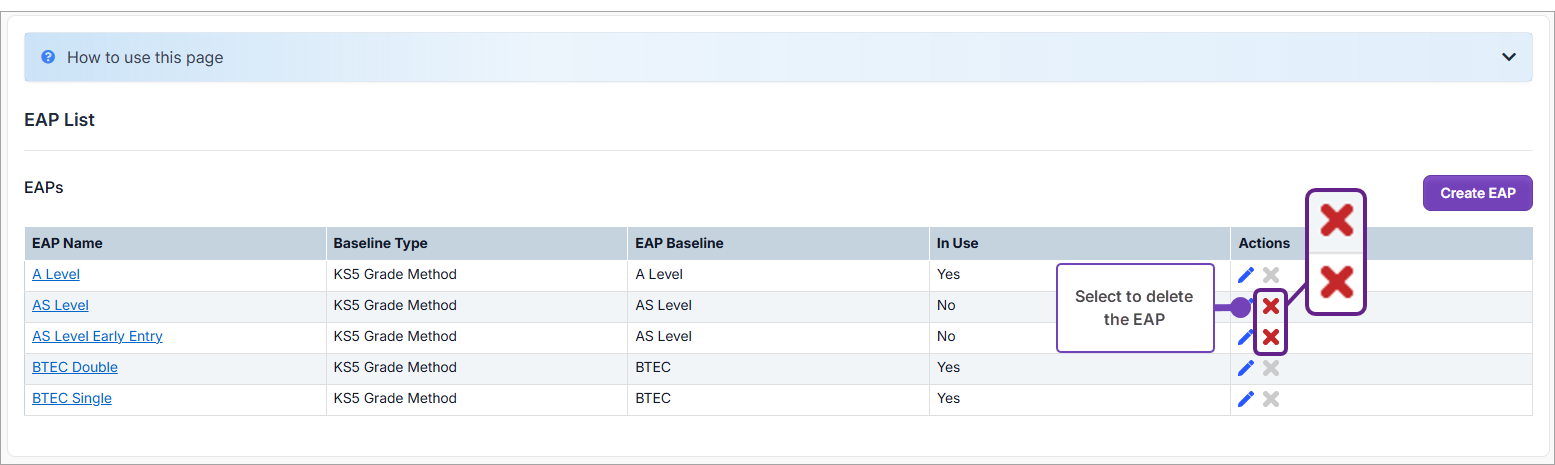 The red X icon will only show if the EAP is not used by any subject on the Matching page. If it is still greyed out, review the Matching page again and ensure that no qualifications have these EAPs selected (see Step 2 above).