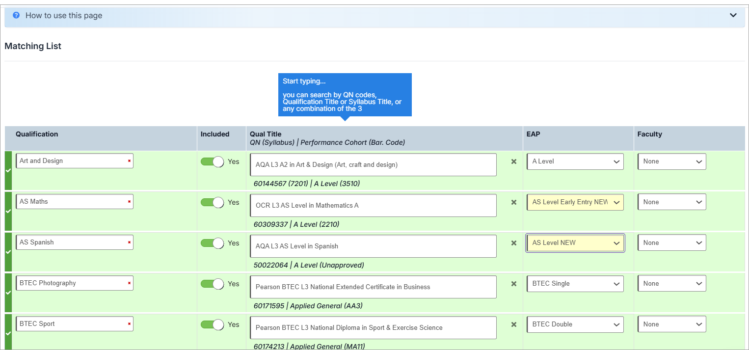 - Ensure the Included toggle is set to Yes for all qualifications using the EAPs that were previously included