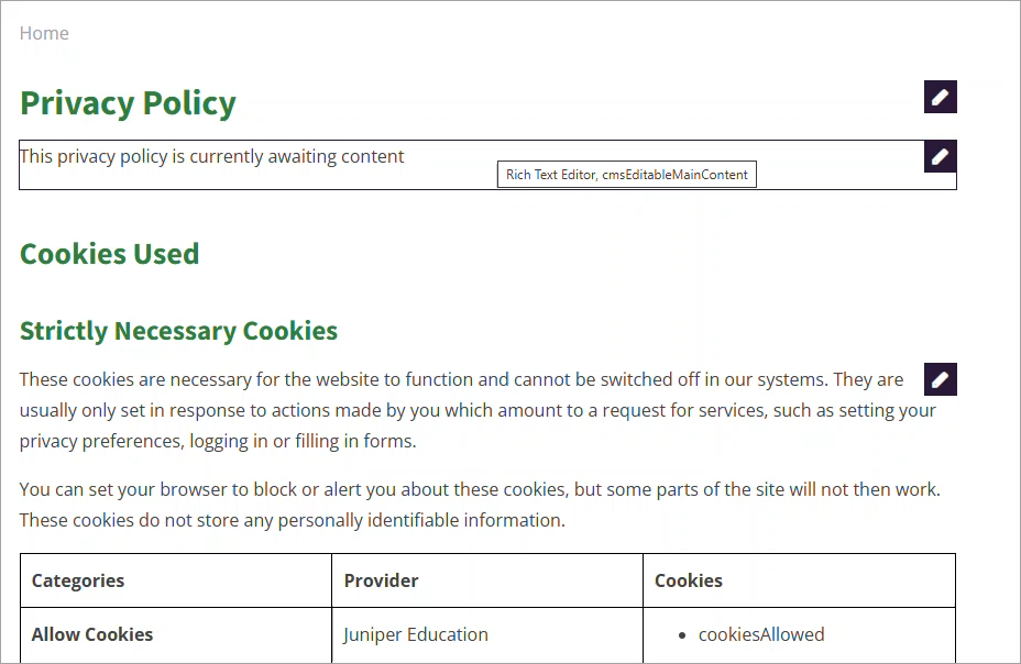 This article explains how to open and update your Juniper Website's Privacy Policy page.