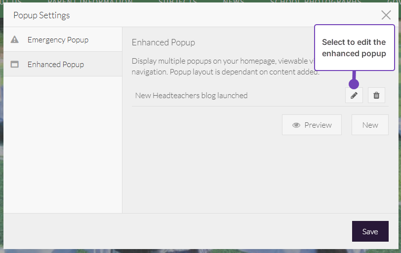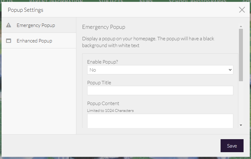 If you are certain that you have pop-up functionality on your website, but cannot see the settings here, you may be looking for the Custom Popup or Emergency Popup. If you don't have this option, we can add it for £65.
