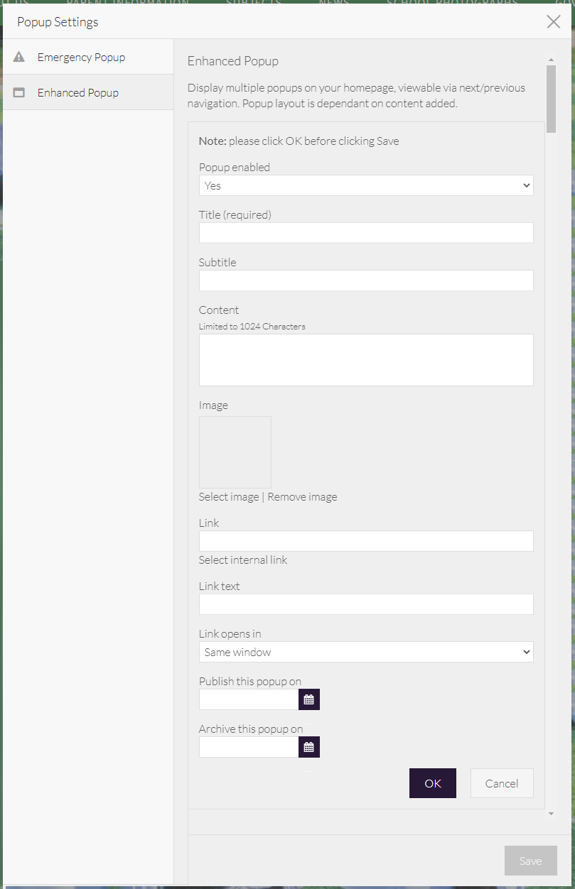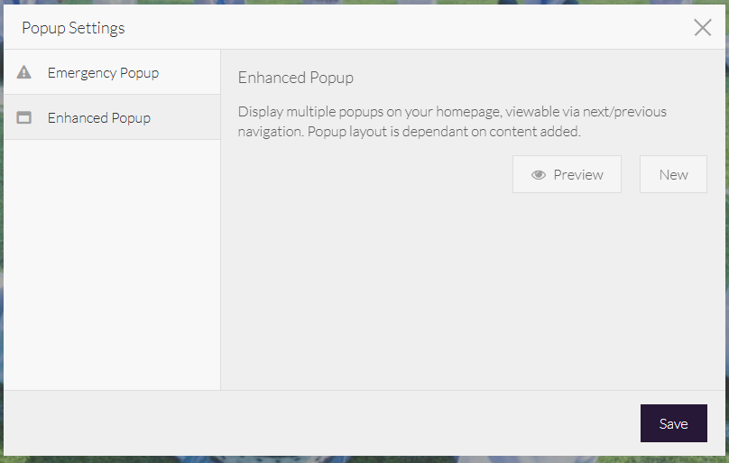 If you are certain that you have pop-up functionality on your website, but cannot see the settings here, you may be looking for the Custom Popup or Emergency Popup. If you don't have this option, we can add it for £65.