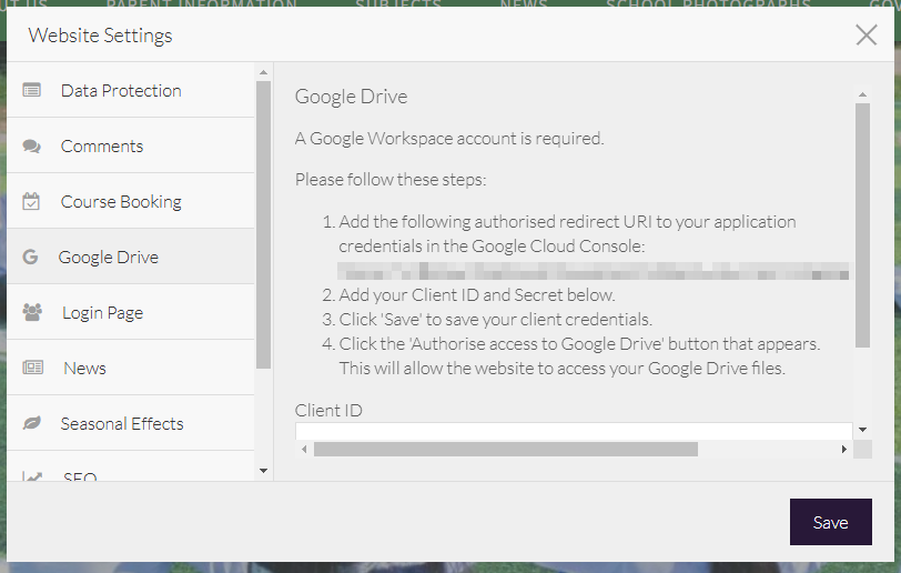 - Your website can link to a Google Drive to allow Google Files to be accessed using the website's File Manager.