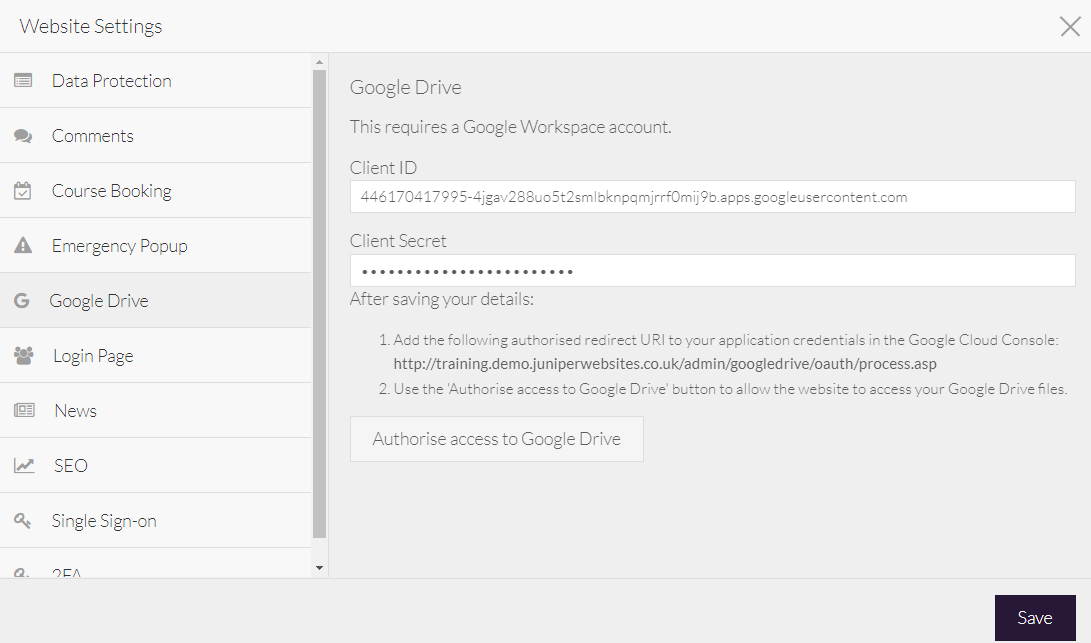 After completing your configuration of Google, you must link your Google Drive with your website through Juniper Websites: