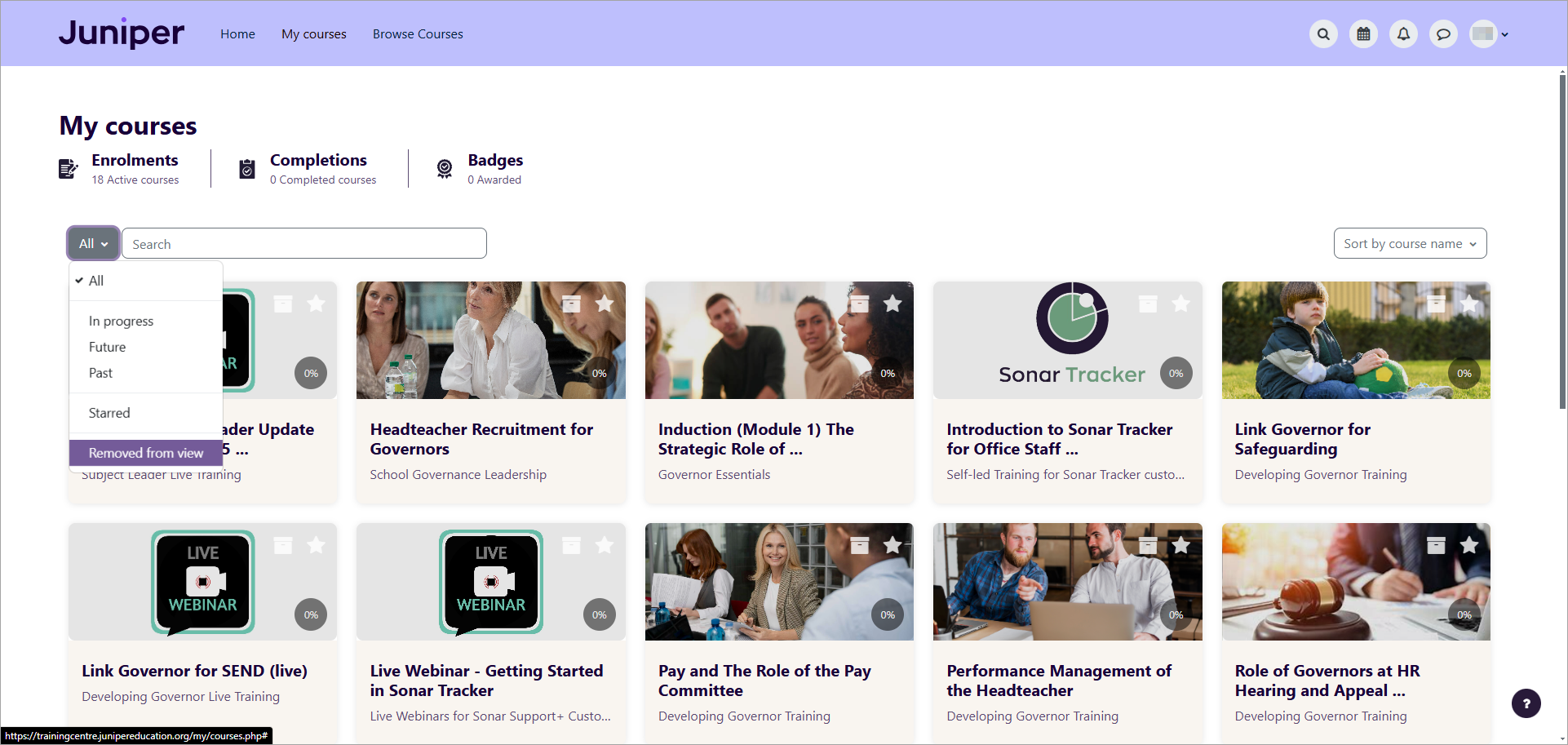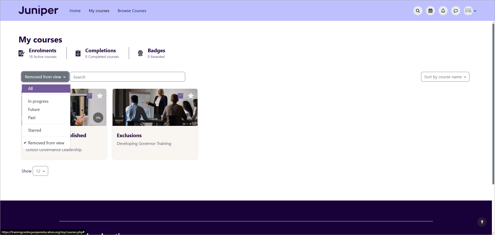 The course will be unarchived and disappear from the archived view. Select Removed from view, then select All: