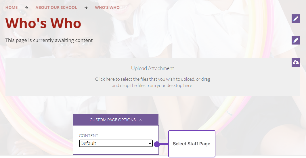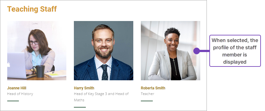 This article explains how to create a Custom Staff Page. A Custom Staff Page contains an image of each staff member, their name and their position in the school. When a viewer selects a photograph, they are linked to a profile page for the individual member of staff: