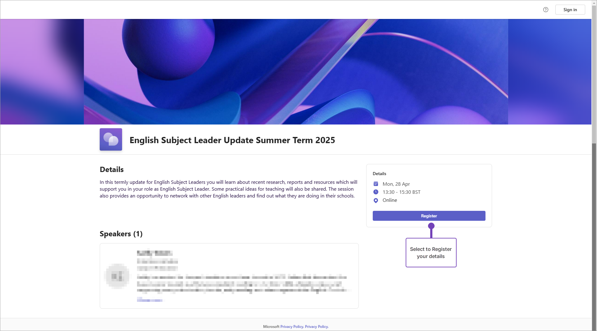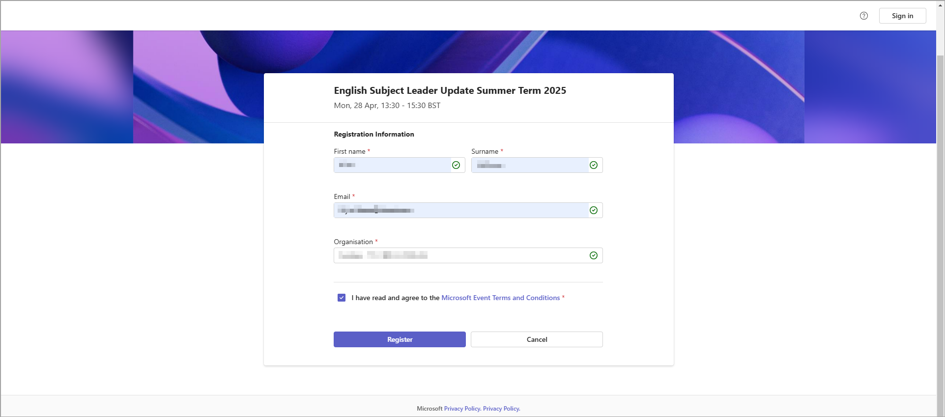 - When prompted, enter the details of the person who you want to register for the webinar (their first name, surname, school email address and organisation name) and check to agree with Microsoft's Terms and Conditions: