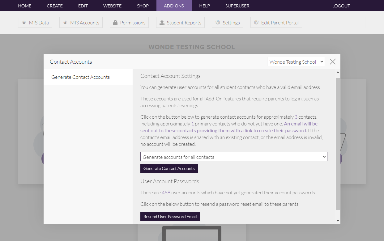 If you want accounts generated automatically when new pupil contacts are added to your MIS and synchronised to the website, configure this through Add-on Settings.