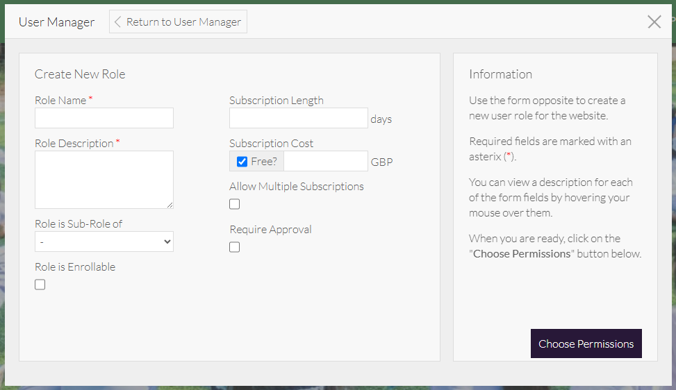 The User Manager window opens: - Select Create New Role to open the Create New Role window: