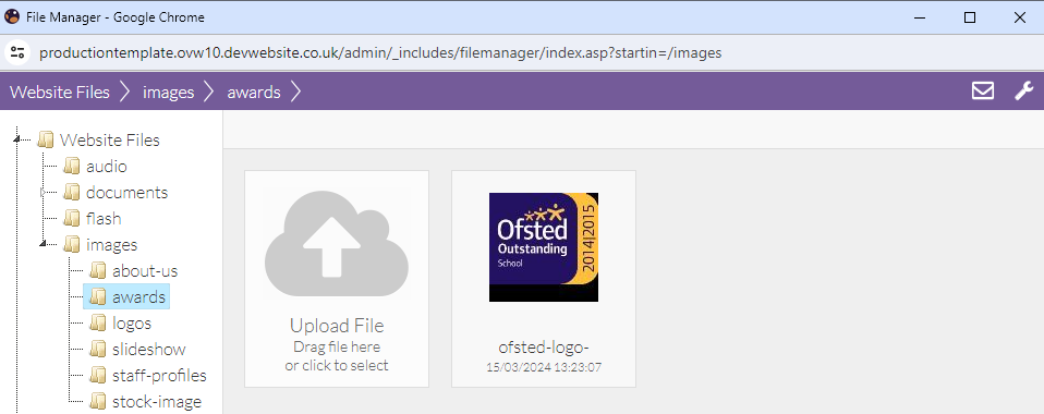 - Select Upload File, or drag and drop images from your device into the File Manager.