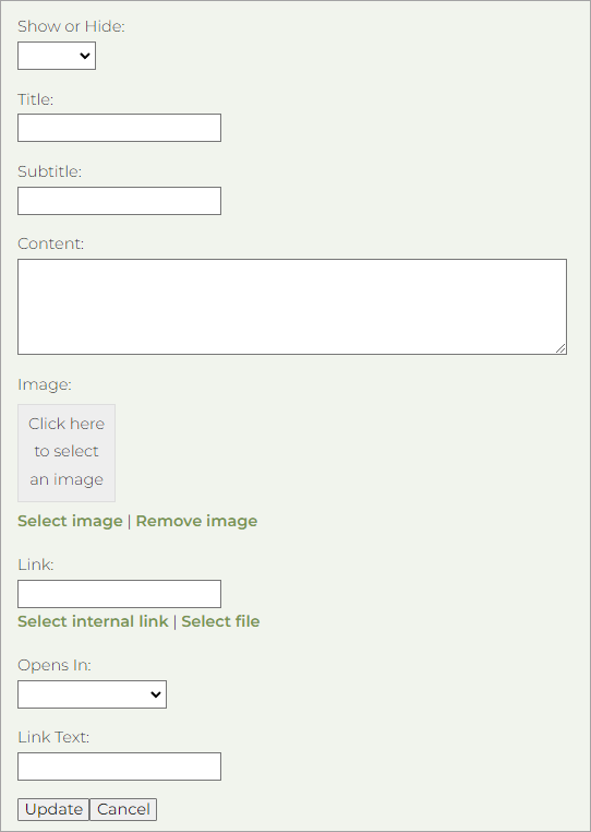 - Complete the form with the details of the message you want to display. The fields may differ from the example here; you may be able to add a title, message wording, an image, and often a link. If the show/hide option is available is used to turn your message on and off. If this doesn't show, the message's existence is typically sufficient for it to display: