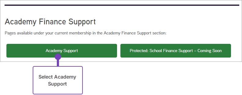 5. You will be logged in to the Knowledge Hub. Scroll down the page to the Academy Finance Support section. Select Academy Support: