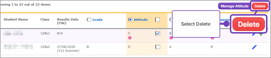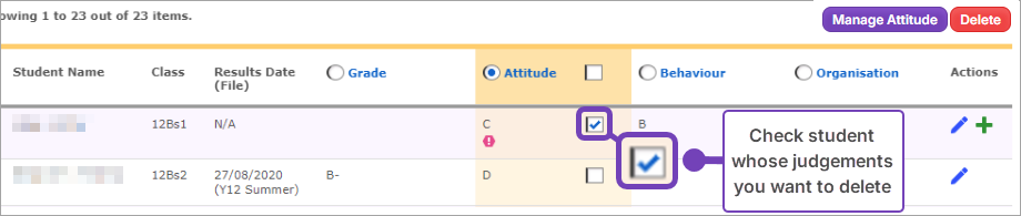- Check students whose judgements you want to delete: