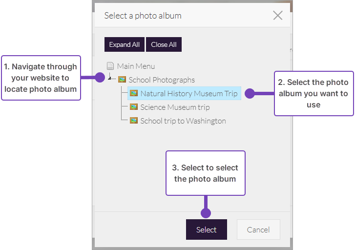 - Select how you want the images to be displayed on your page from 1, 2, 3 or 4 Across in a grid, or Slideshow (by default, 3 Across is selected).