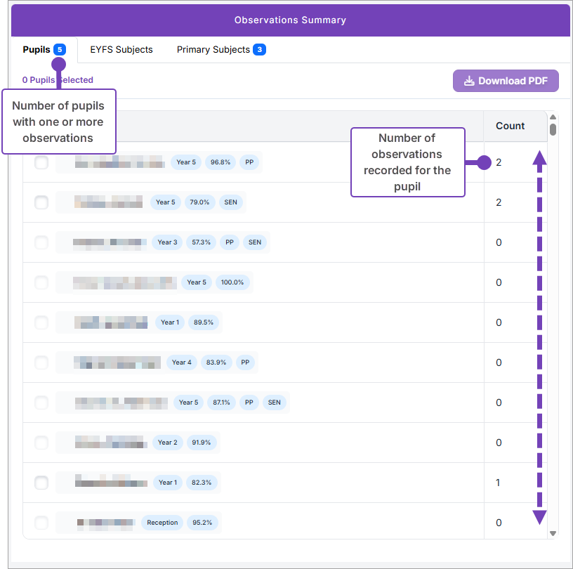 - The total number of pupils with observations. In this example, 5 pupils have observations recorded against their name. Two pupils have 2 observations each, and three pupils have 1 observation recorded against their name. This gives a total of 5 pupils (as shown in the blue lozenge)