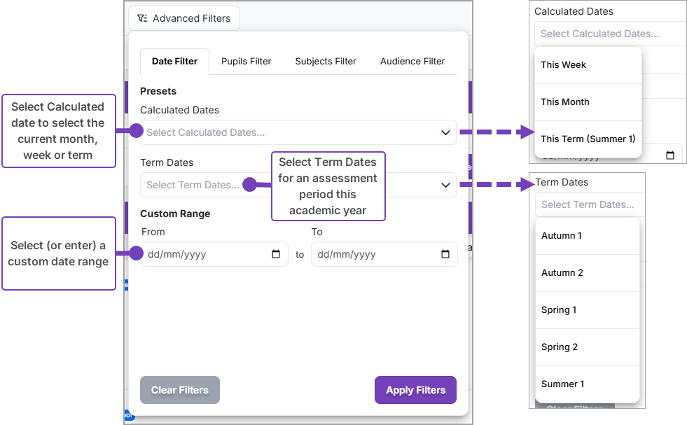 - Select Term Dates to show observations for a specific term during this academic year. Select from the data entry points you have configured, for example: