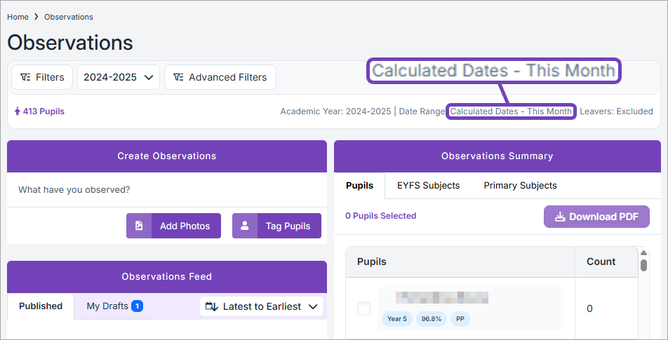 The Observations page updates to display only observations made for the selected group of pupils for the time you selected using the Date Filter. The selected range will be indicated in the Filter pane at the top of the page. In this example, the current month has been selected: