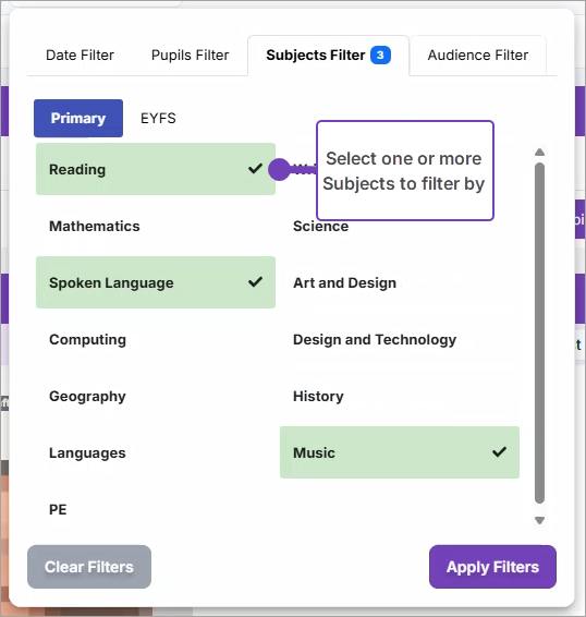 - From the Subjects Filter tab, select either Primary or EYFS subjects: