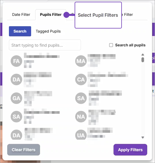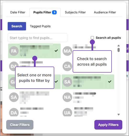 The Observations page updates, displaying only observations for those Pupils selected using the Pupils Filter within Advanced Filters.