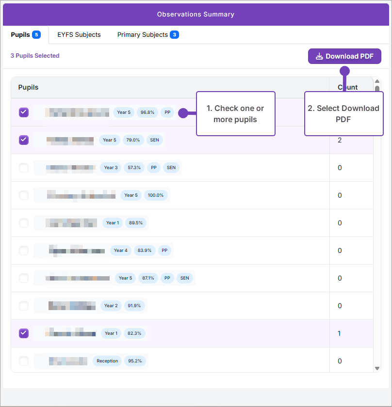 - Check the names of the pupils whose observations you want to create a PDF for. As pupils are checked, the number of pupils indicator increases (in this example, to 3 Pupils Selected)
