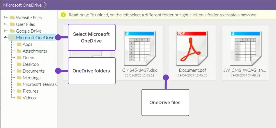 4. Select Microsoft OneDrive from the File Manager window to view the files stored in OneDrive, along with any OneDrive folders: