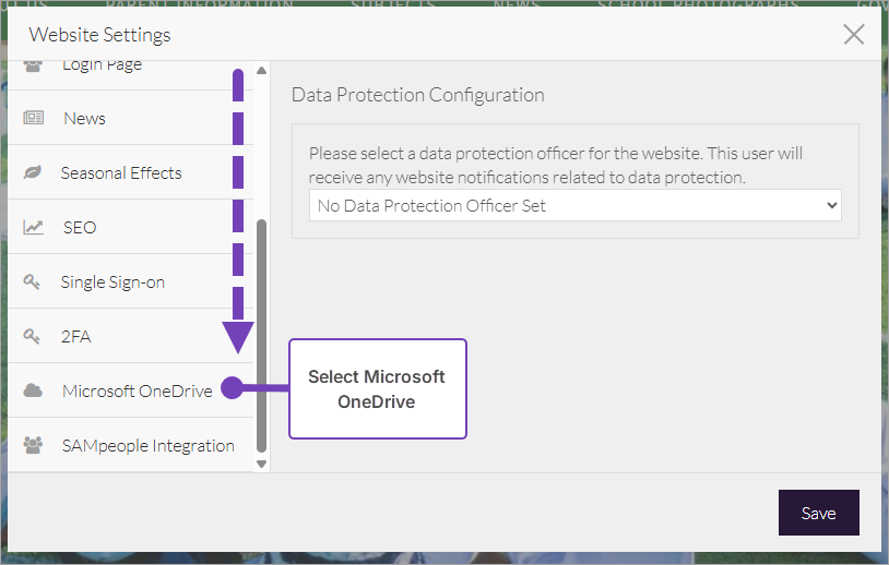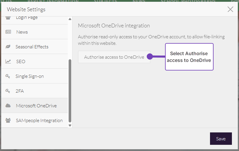 When configured, any logged-in user can access all content in the linked OneDrive account. For this reason, we recommend you create a dedicated OneDrive account for Website content, rather than use an individual staff member's OneDrive account that may hold sensitive information you wouldn't wish to share with other members of staff.