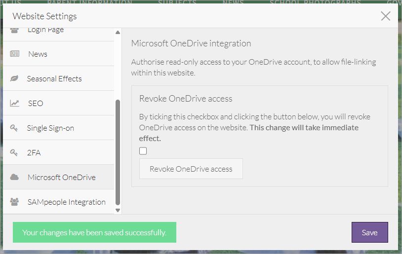 6. Once you have successfully entered your school's OneDrive account details, you will be returned to the Website Settings window,where the message OneDrive access has been successfully authorised is displayed:
