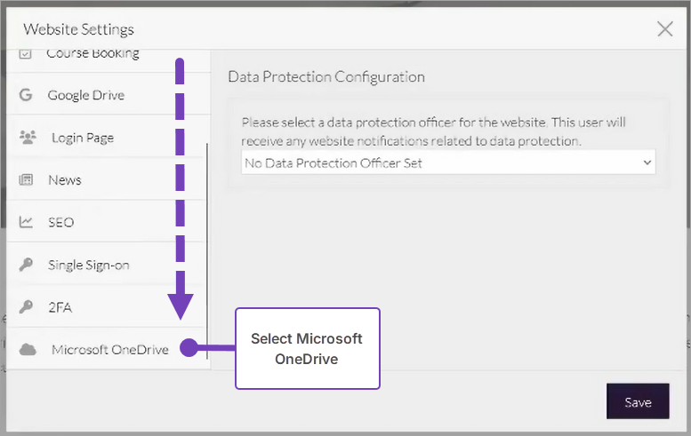 - From the Websites Settings window, scroll down and select Microsoft OneDrive: