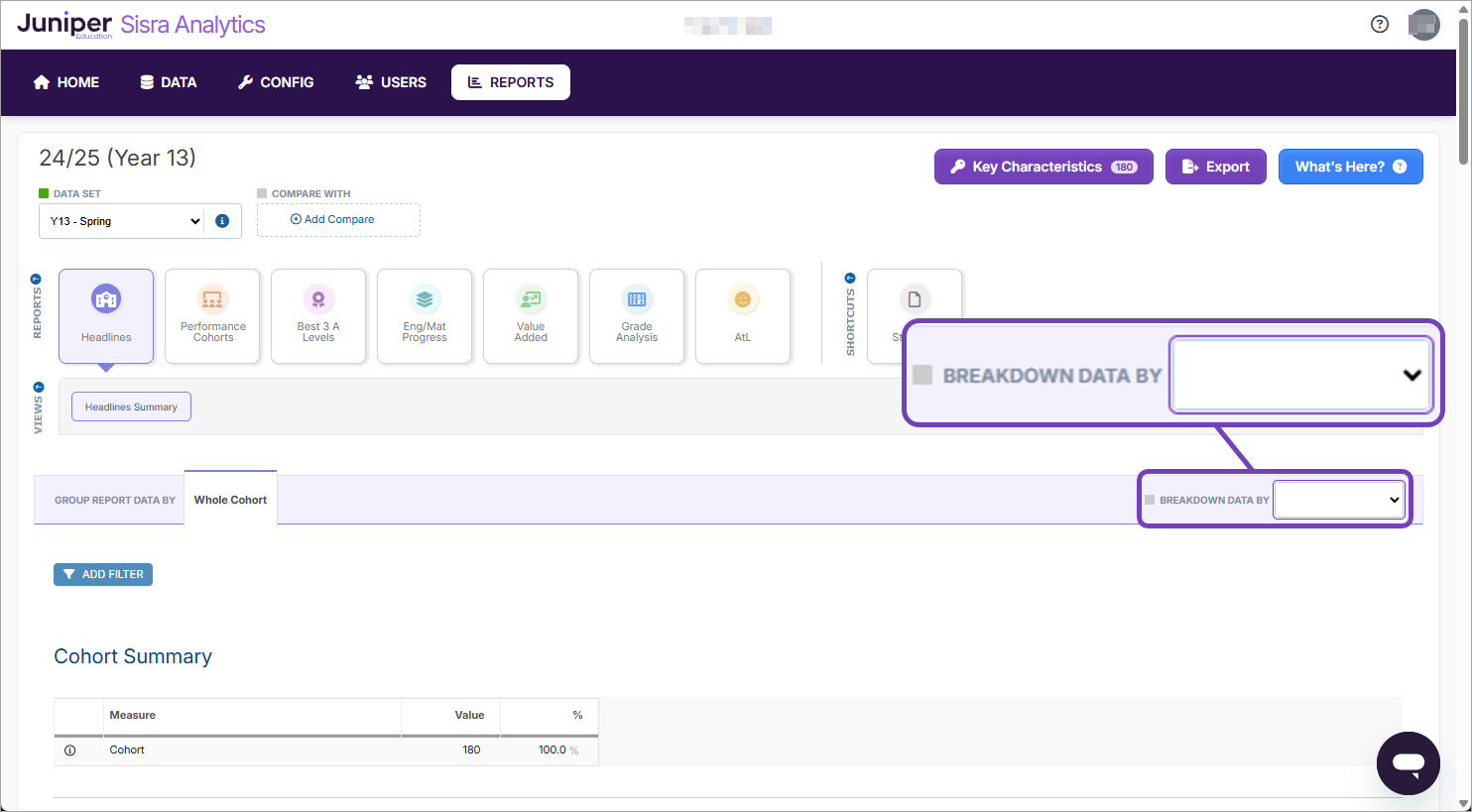 7. Select BREAKDOWN DATA BY on the different report views to select the key group you would like to analyse:
