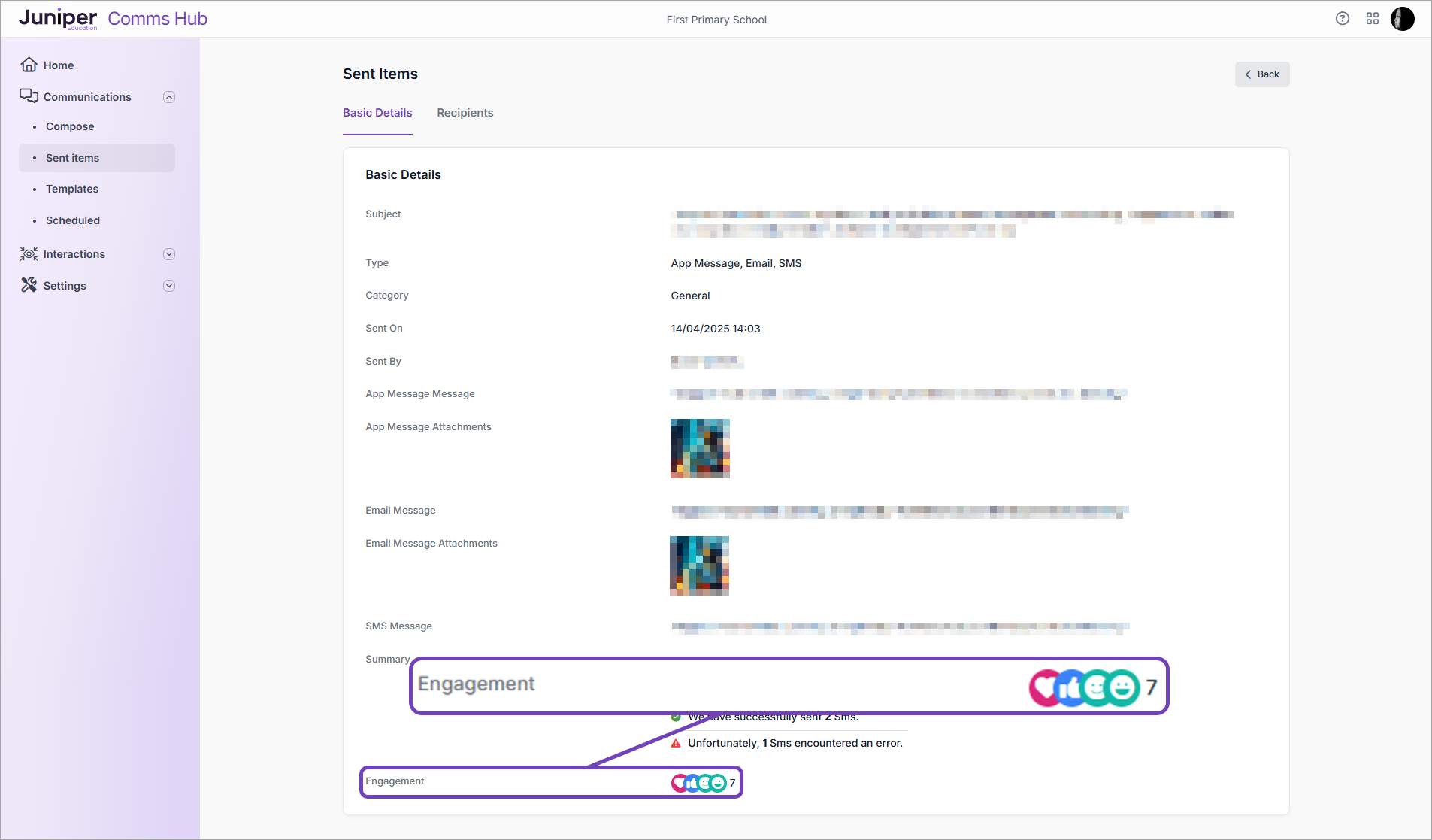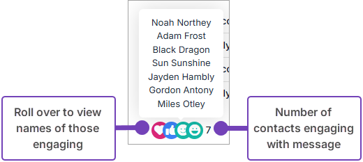 - Roll over the engagement icons to view those contacts who have engaged with your message. The total number of contacts that have engaged with the message is also displayed: