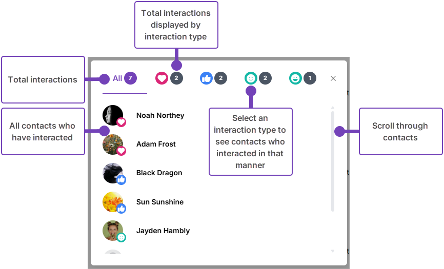 A window displays the interaction count, types, and names of all contacts who engaged with the App Message. Select an interaction icon to see which contacts interacted in that manner: