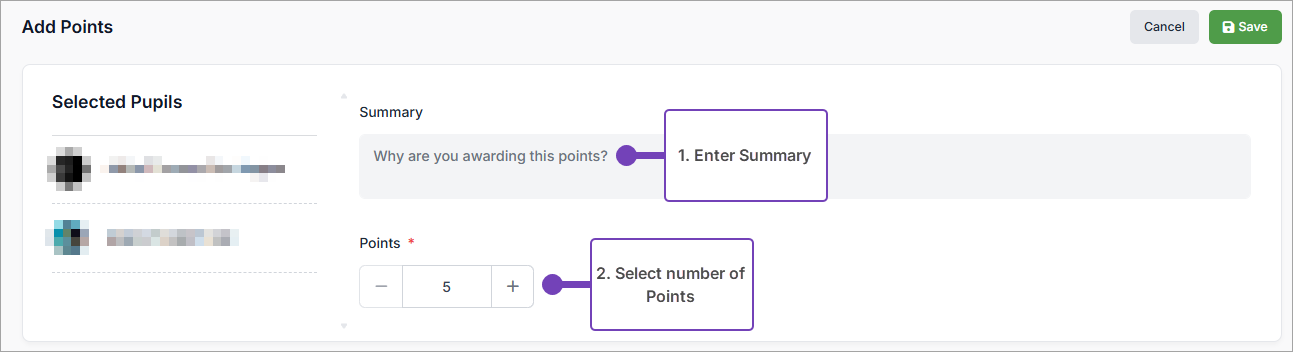 This article explains how to add points in increments of five or more (up to 25), for one or more pupils in Comms Hub.