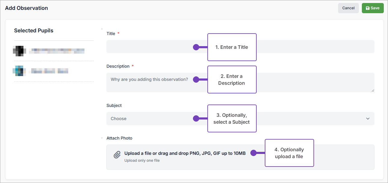 - Enter a Description explaining why you are adding the informal observation for the selected pupil(s).