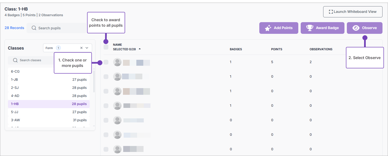 Check one or more pupils whom you want to record the observation for (you can only see those pupils who are in your classes). You can select all pupils by checking the checkbox next to Name Selected.