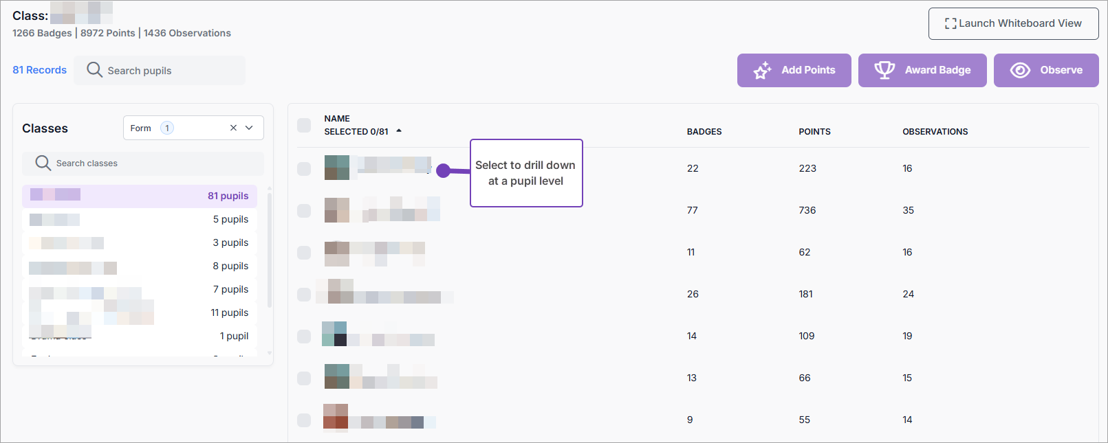 - The Class page loads. Select the pupil's Name to drill down into the specific informal observations recorded.