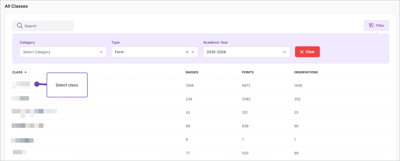 To view observations from a previous year, select the appropriate Academic Year. When viewing by different academic years, you will only be able to see the classes you taught in that academic year, as they were at that time. You cannot see the results for your current classes in a previous academic year, unless you taught the pupils in a class in that year.
