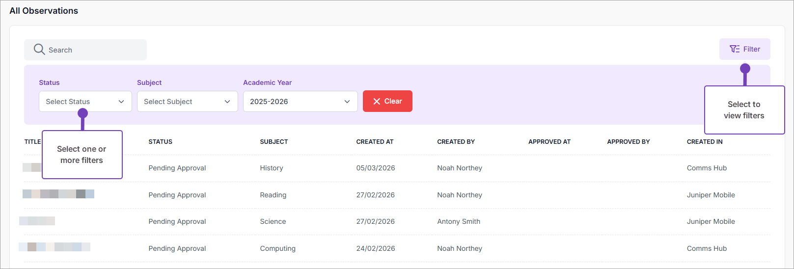 Follow these steps to view all informal observations and their status from within Comms Hub: